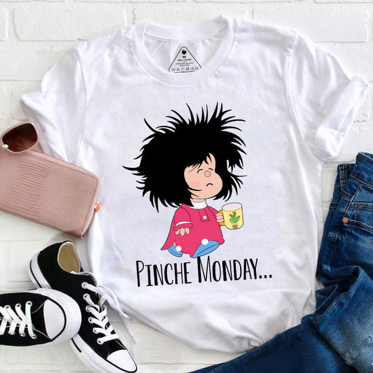 Funny Pinche Monday T-Shirt with Sleepy Cartoon Character & Coffee Mug