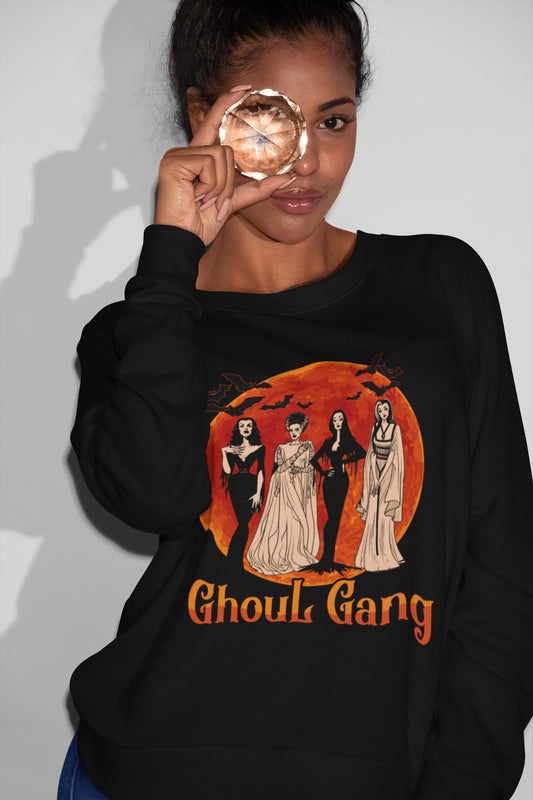 Ghoul Gang Halloween Shirt with Classic Female Monsters and Orange Moon