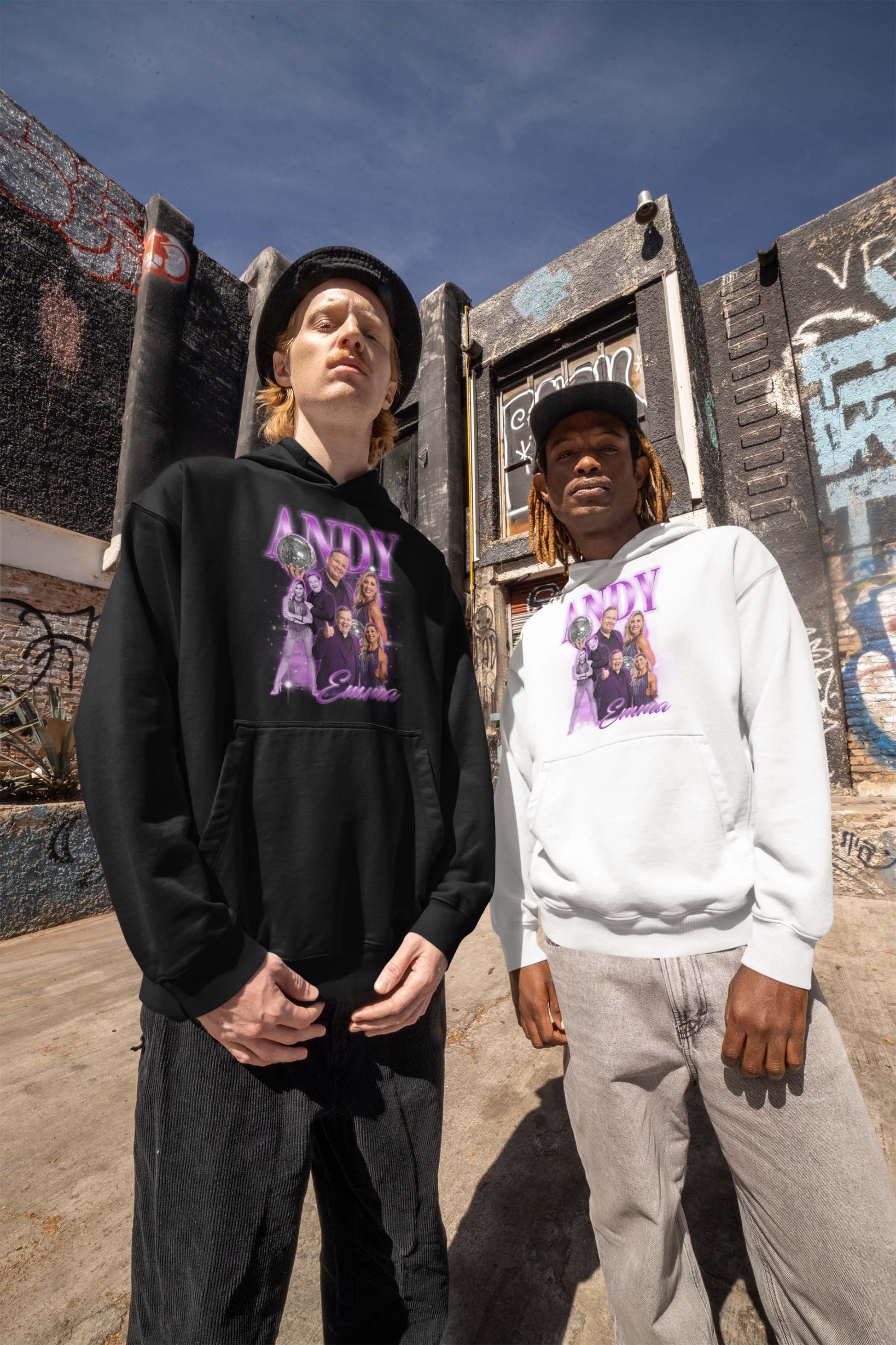 Show your love for Andy & Emma with this unique retro-style t-shirt featuring a vibrant collage of their dancing moments highlighted with glowing purple effects and classic disco elements. Perfect for fans and dance enthusiasts who want to wear their passion!