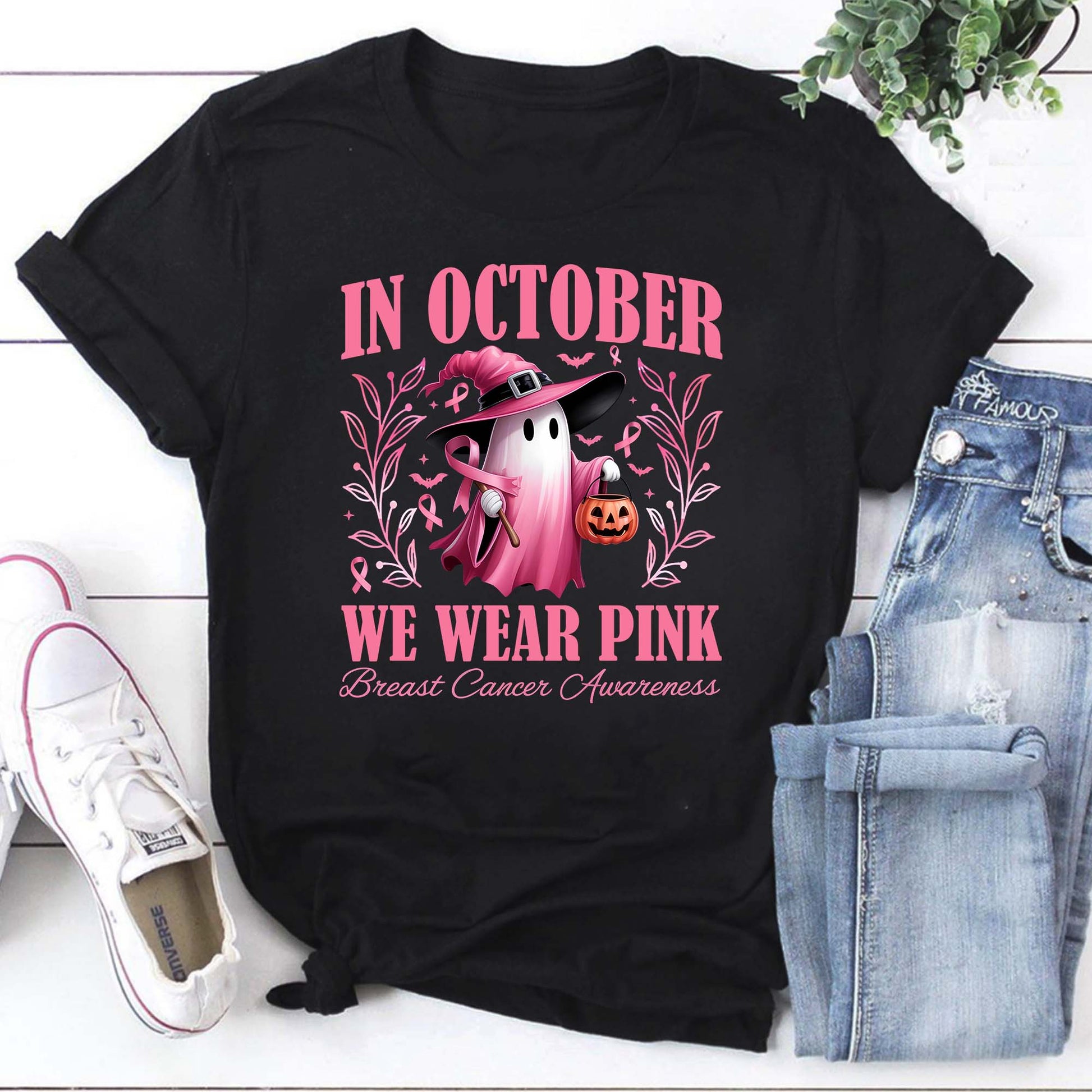 Breast Cancer Awareness October Shirt with Pink Ghost and Halloween Pumpkin