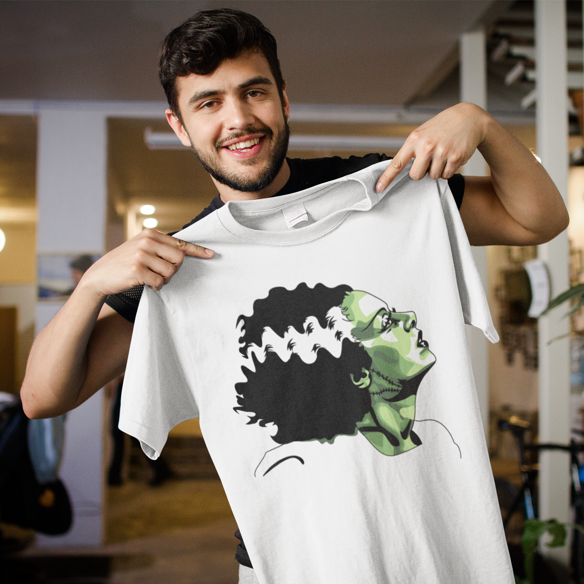 - Graphic print of Bride of Frankenstein’s side profile with distinctive stitches and flowing hair