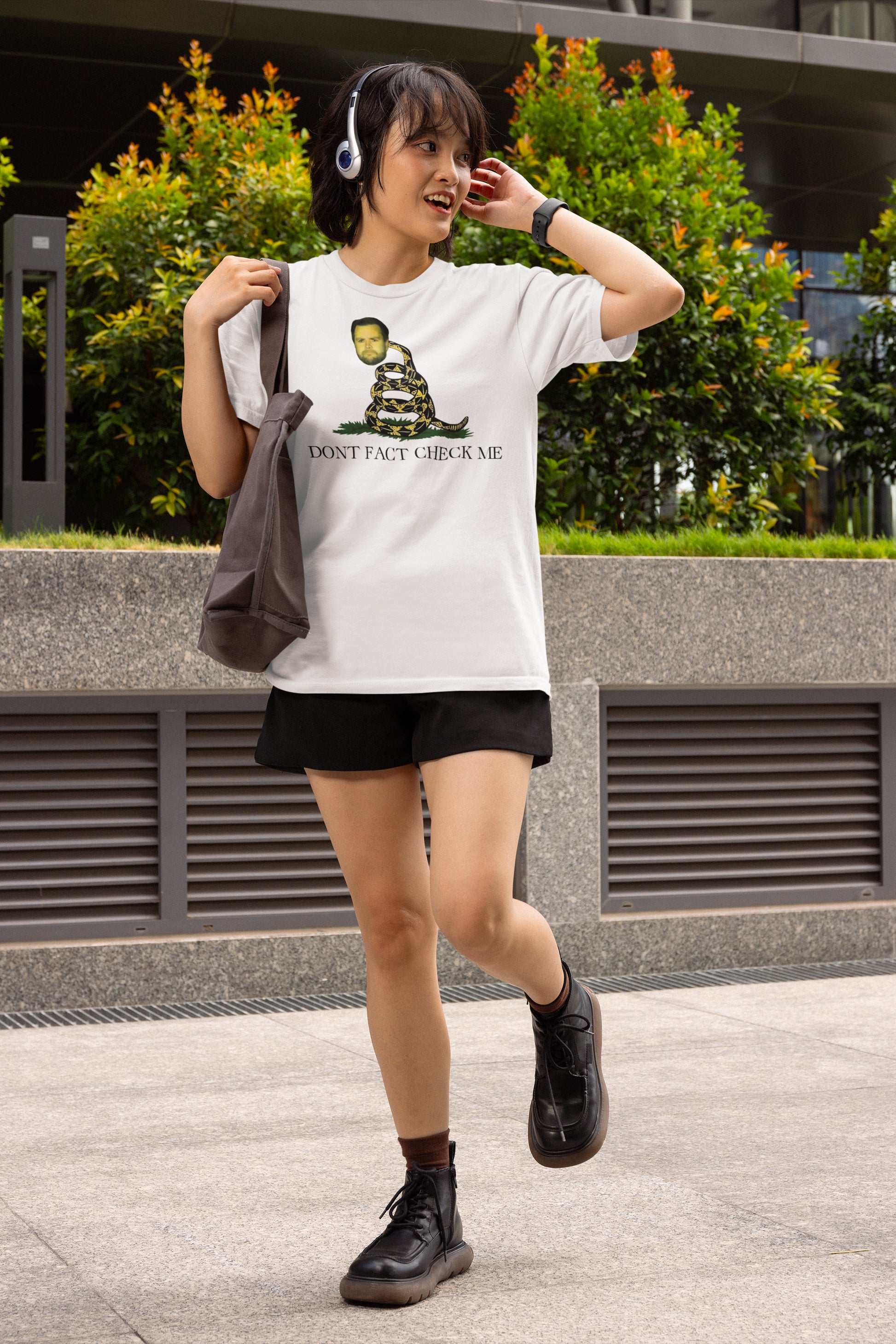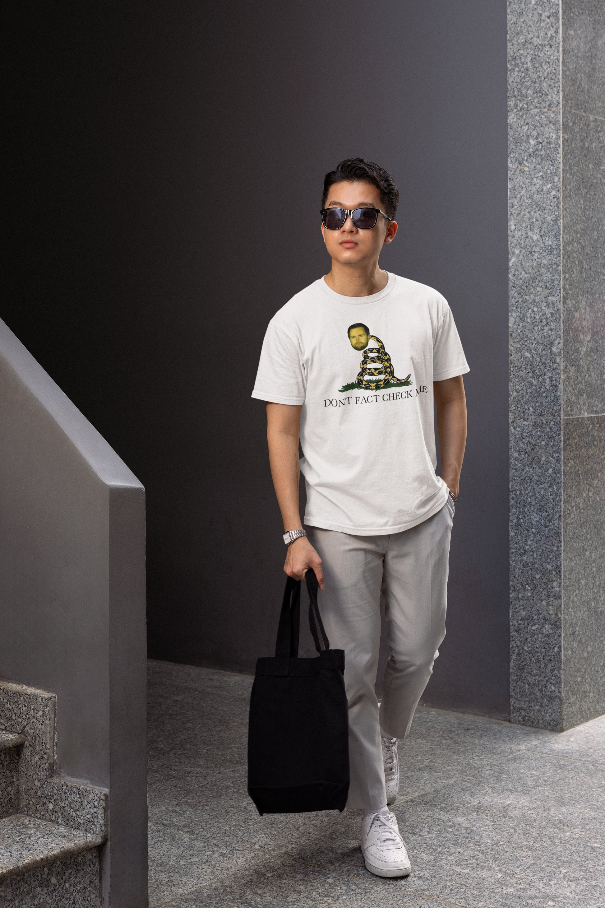 Show off your witty side with this humorous graphic t-shirt combining a snake illustration with a funny, expressive human face and the bold phrase Don't Fact Check Me. It’s a light-hearted way to make a statement and spark conversations.