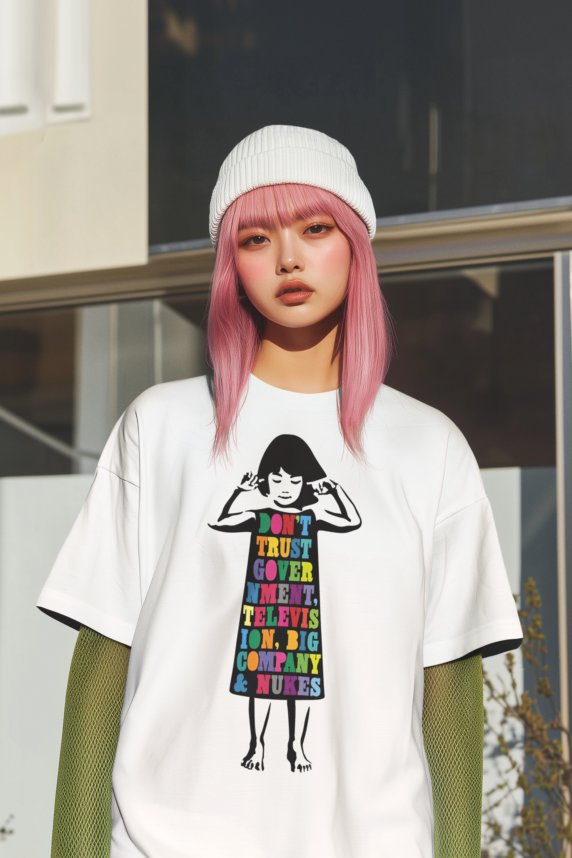 Make a powerful statement with this eye-catching 'Don't Trust Government, Television, Big Company & Nukes' t-shirt. Featuring a striking illustration of a child covering their ears with the colorful typography embedded in their dress, this design delivers a clear message about skepticism and awareness.