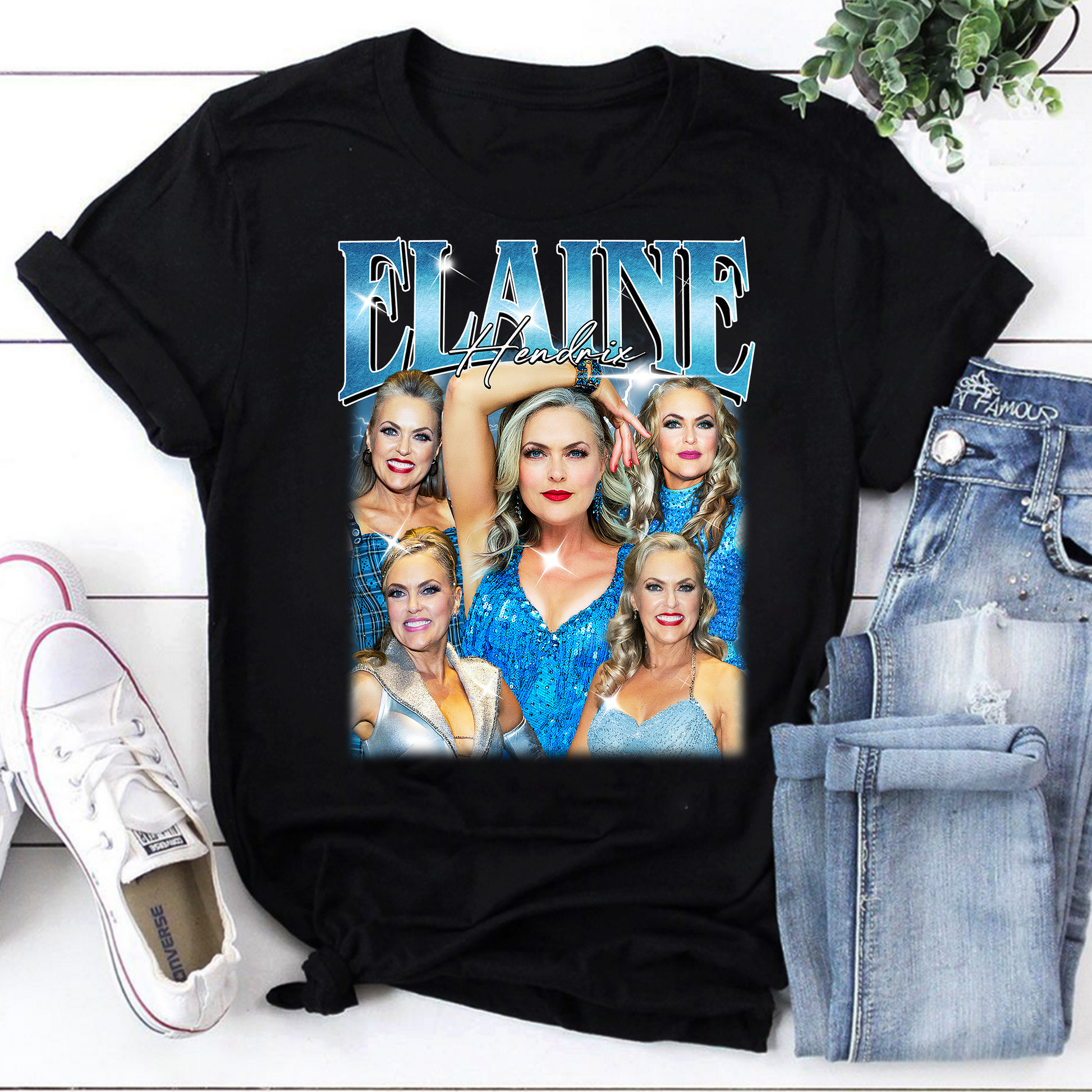 Celebrate the iconic style and dazzling presence of Elaine Hendrix with this vibrant graphic tee featuring a collage of glamorous portraits. Each image showcases her in sparkling blue outfits, capturing her confident and unforgettable look.