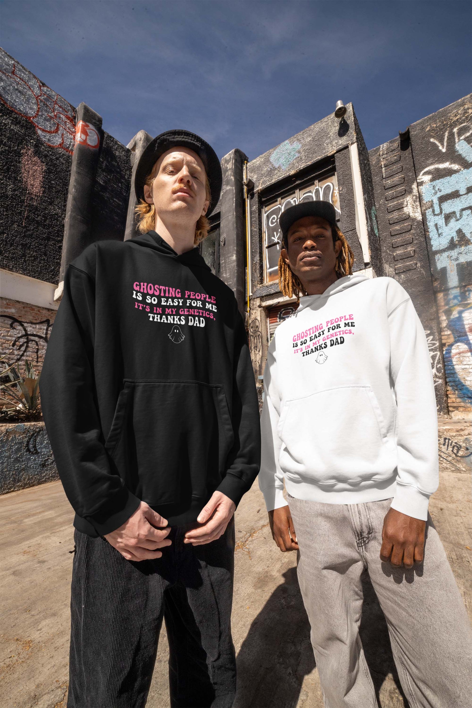 Make a bold and humorous statement with this witty 'Ghosting People Is So Easy For Me, It's In My Genetics, Thanks Dad' tee. Perfect for anyone who loves clever family humor mixed with a playful ghost theme.