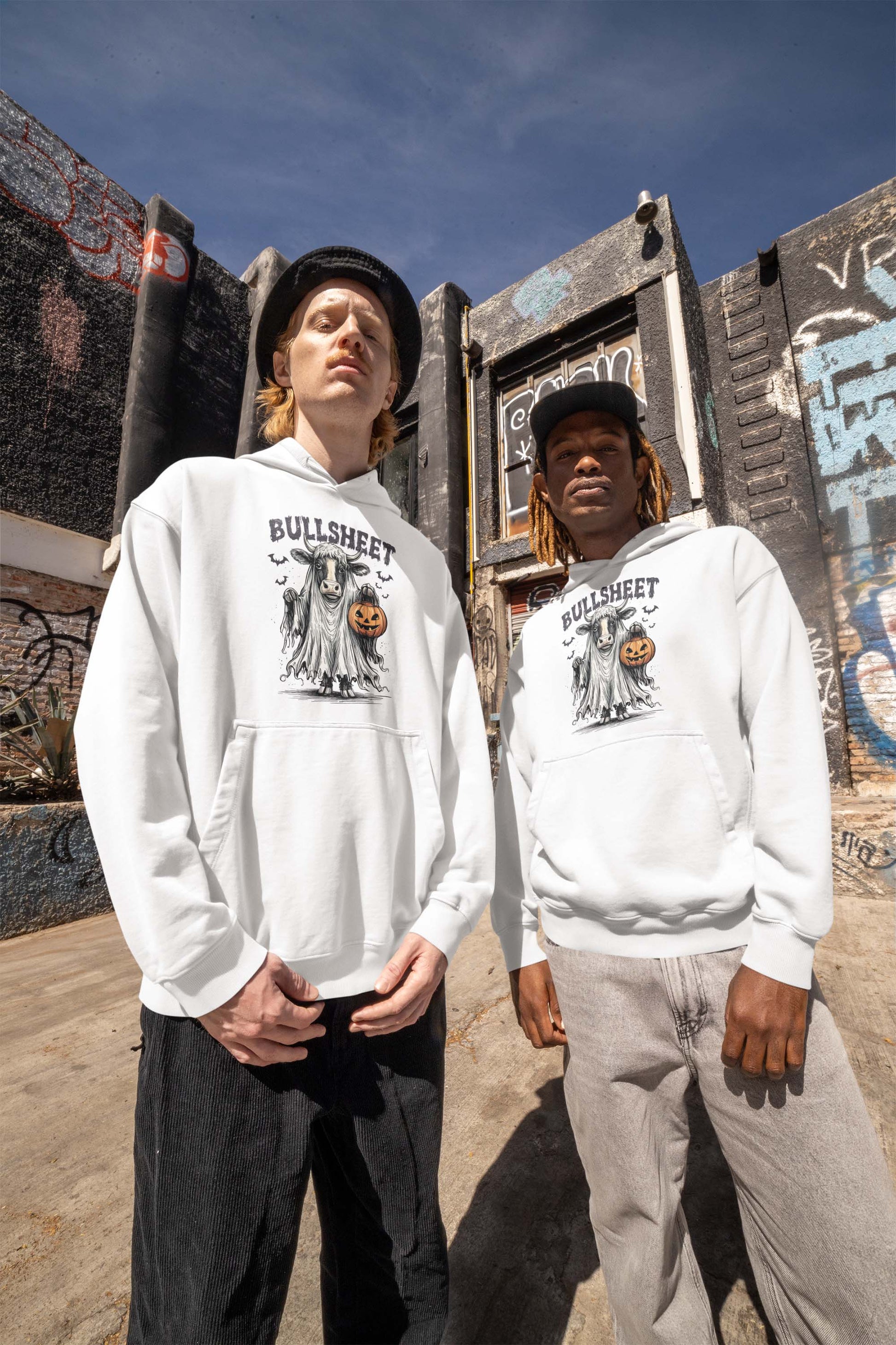 - Unique Design: Playful cow ghost holding pumpkin lantern with bold 'BULLSHEET' text for a fun twist on Halloween costumes.