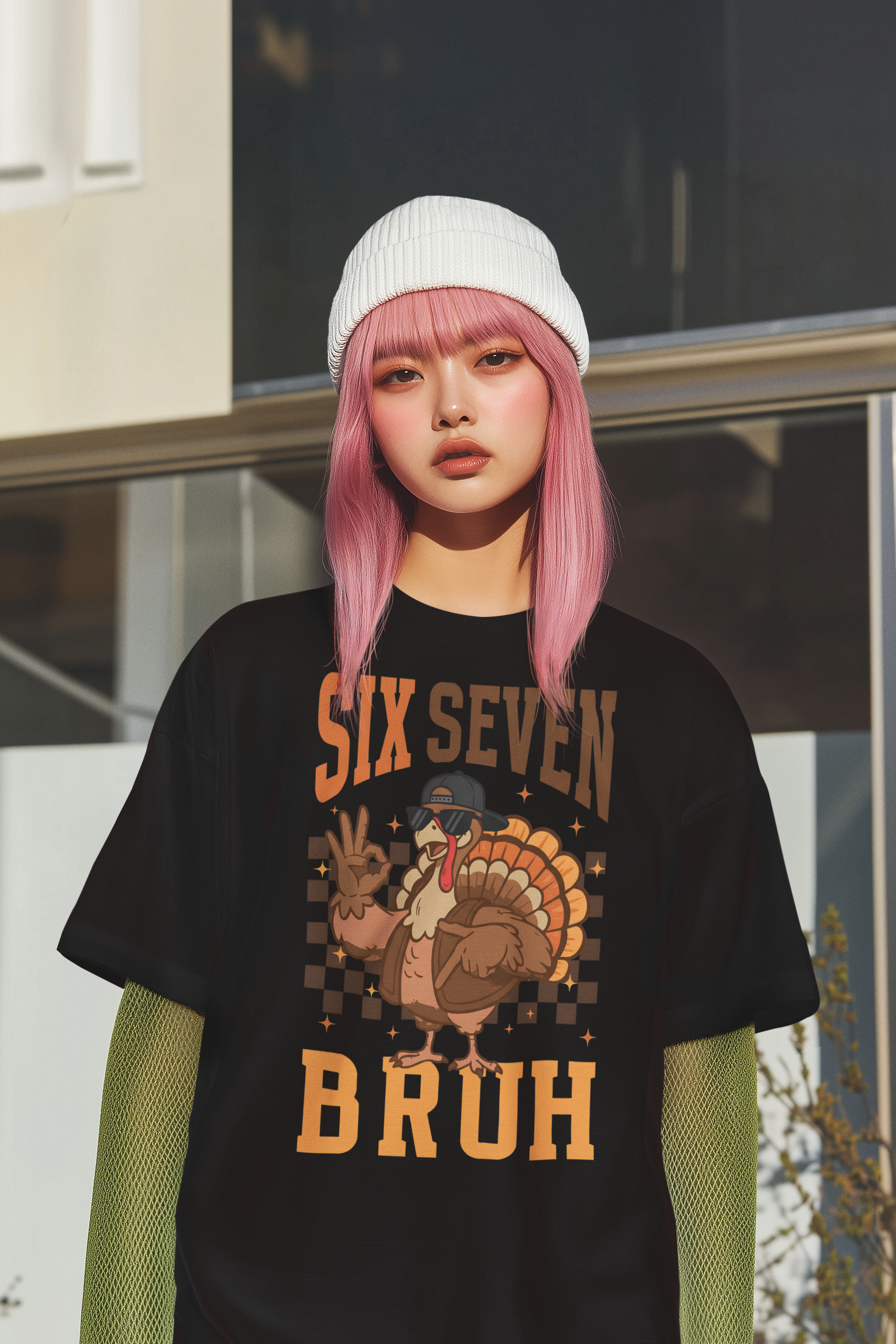 • High-quality printed turkey graphic with 'Six Seven Bruh' text