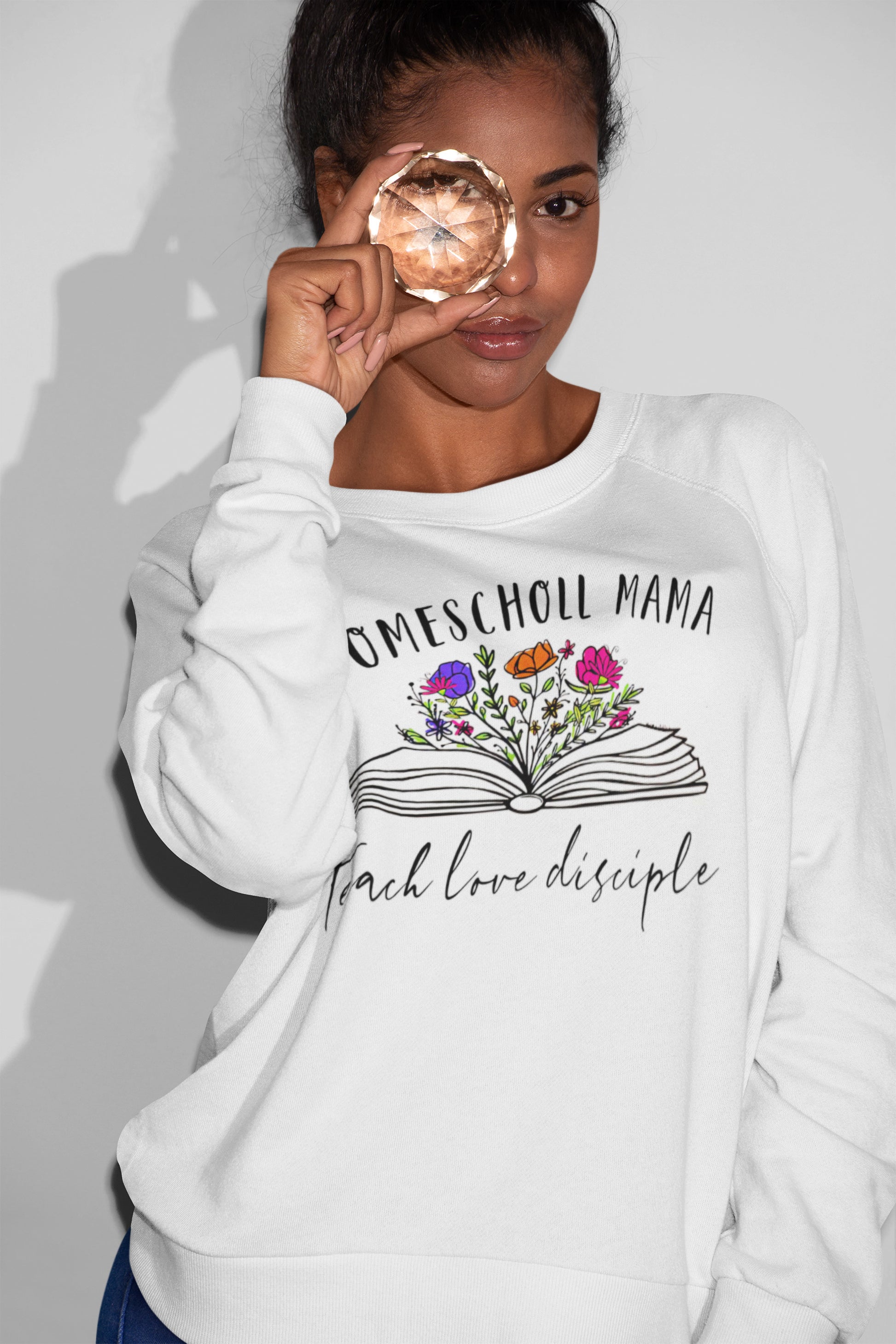 Homeschool Mama Sweatshirt with Floral Book Design - Teach Love Disciple Cozy Top