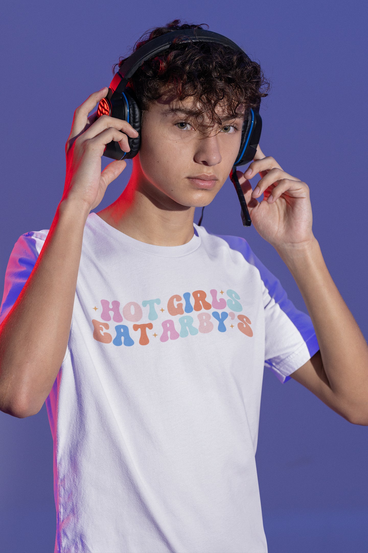 Step out with confidence and a smile wearing this Hot Girls Eat Arby's Colorful Retro Graphic Tee—a statement of fun, food, and fabulous style!