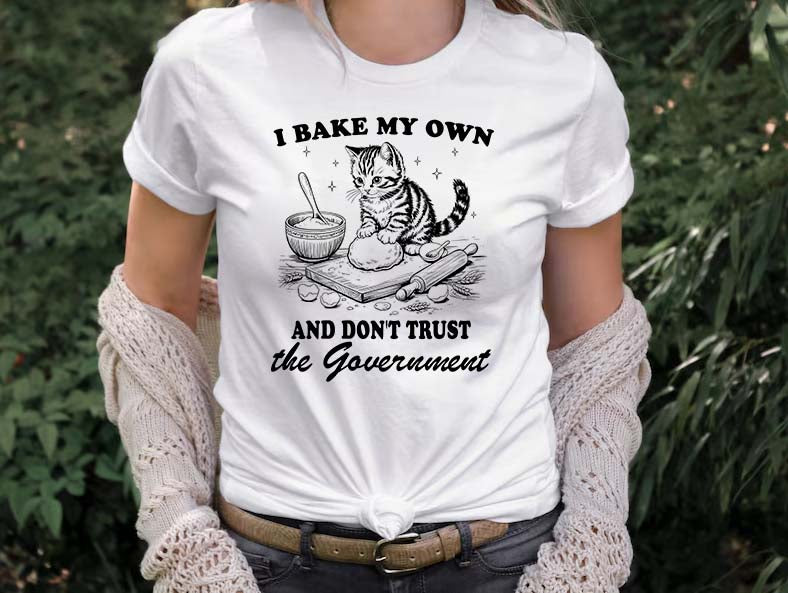 Embrace your self-reliant baking style with this charming cat graphic tee—great for baking lovers who trust their own hands more than the government.