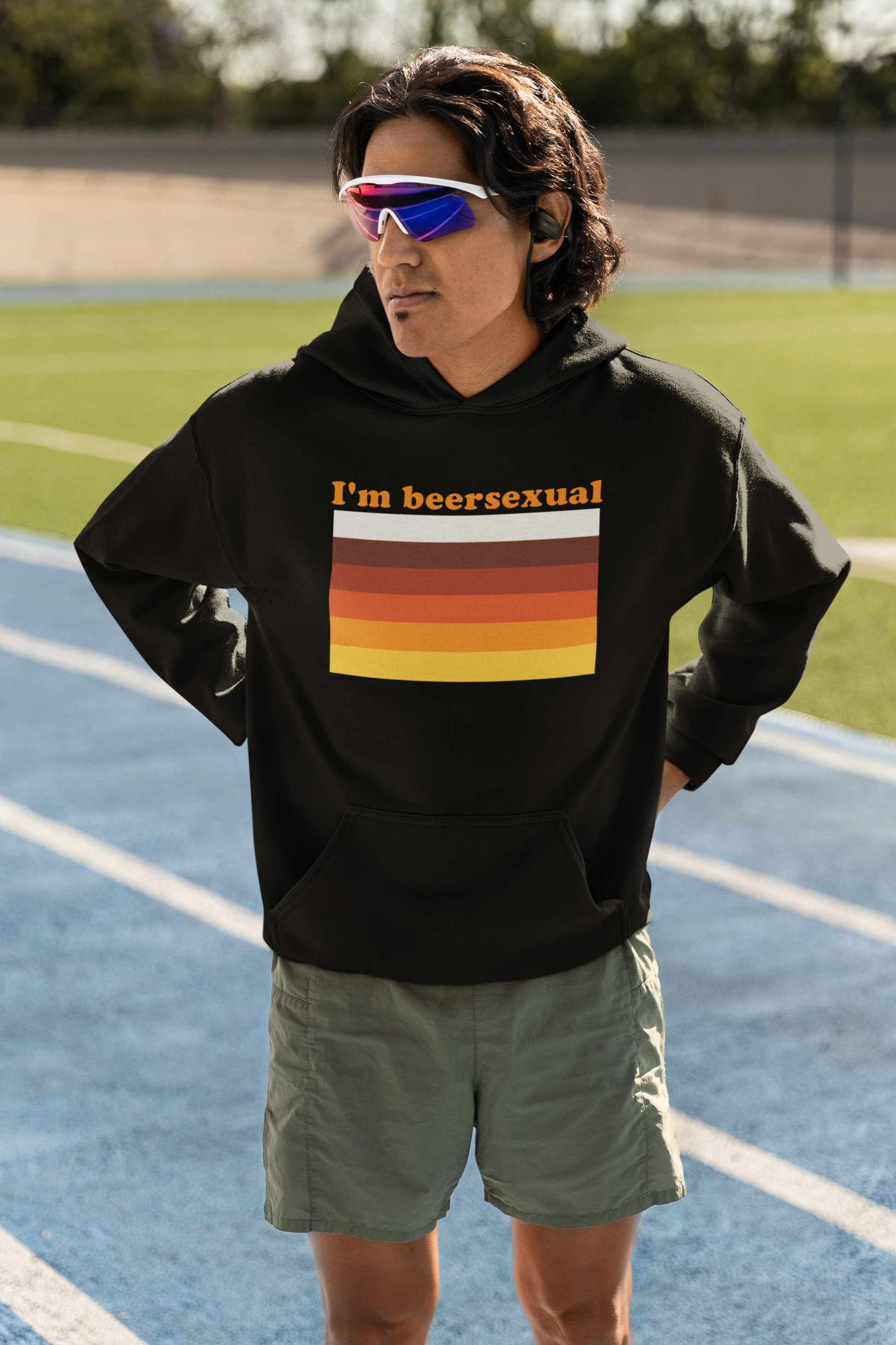 - Bold design: Bright orange "I'm beersexual" text paired with a retro striped beer pride flag.