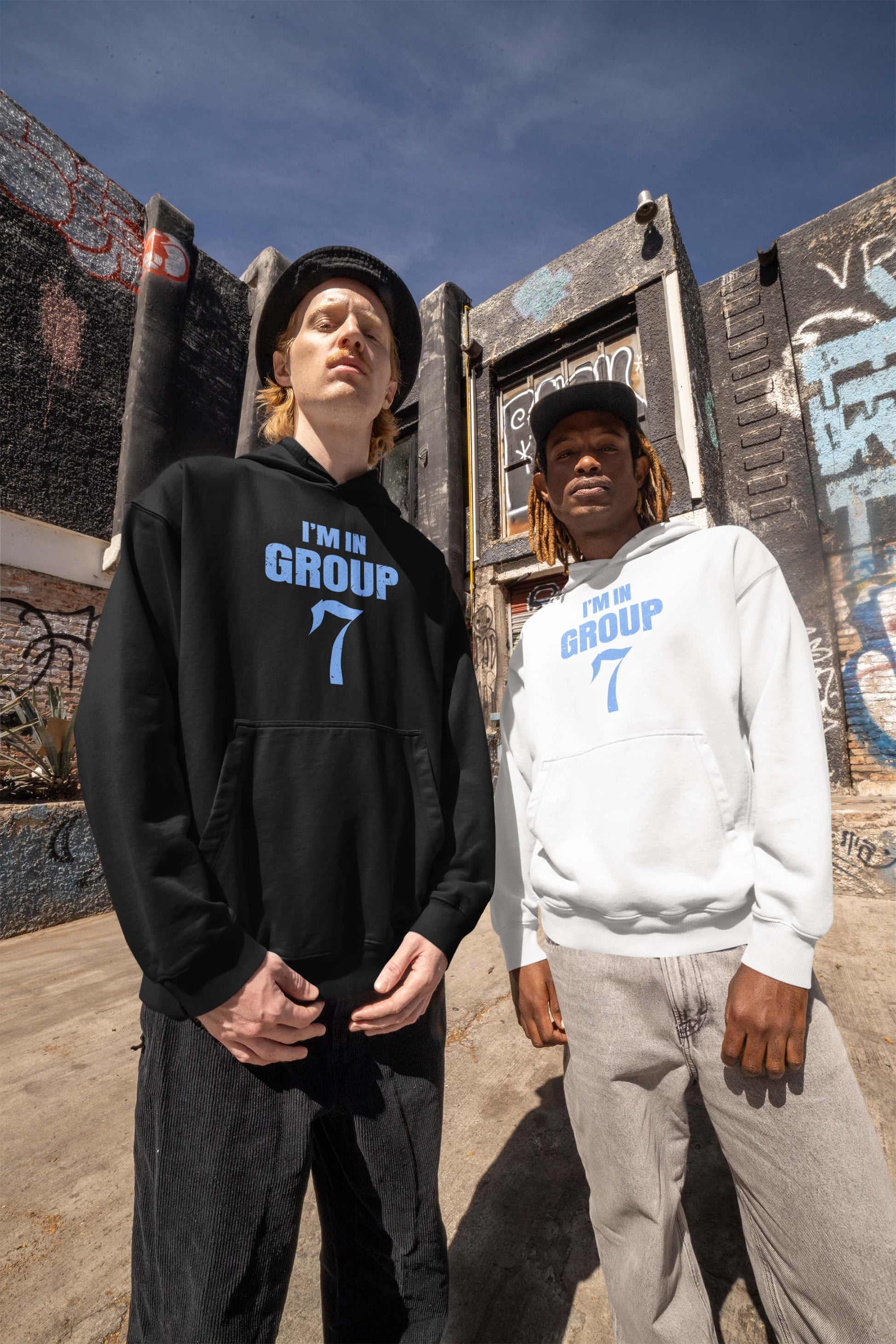 - Bold light blue distressed print saying "I'm In Group 7" makes a statement