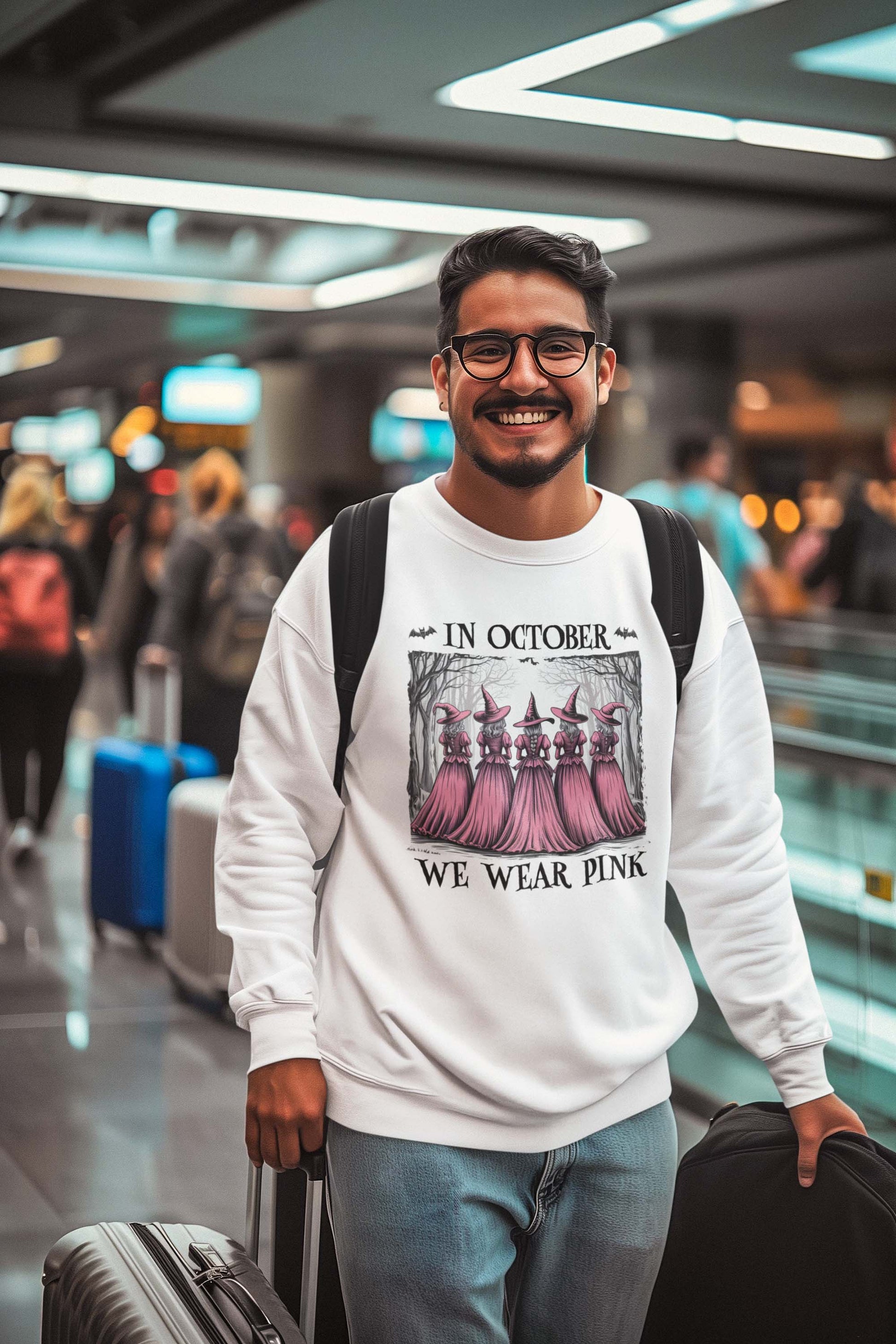 This charming In October We Wear Pink Witch T-Shirt blends spooky Halloween vibes with a unique pink twist. Featuring five elegant witches in pink dresses and hats, this design offers a fresh take on October fashion that’s both festive and fun.