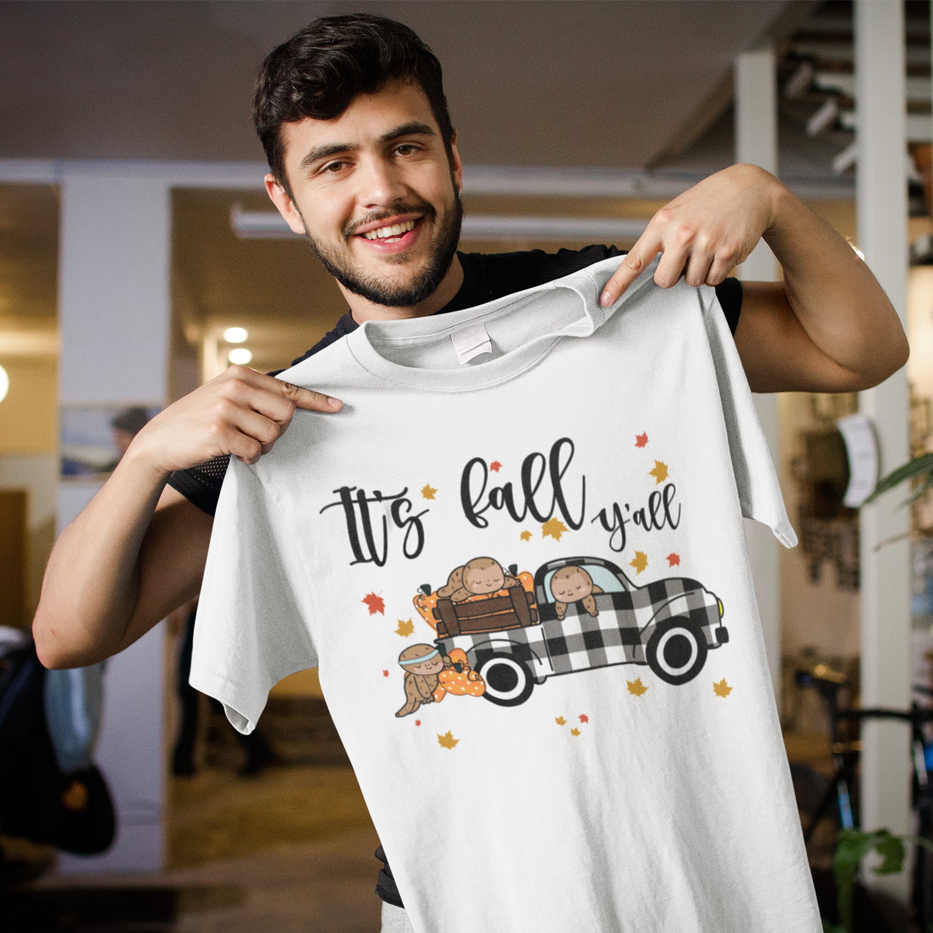Celebrate the beauty of autumn with our charming "It's Fall Y'all" sweatshirt, featuring adorable sloths lounging around a buffalo plaid truck loaded with pumpkins. This design perfectly captures the cozy and relaxed spirit of fall.