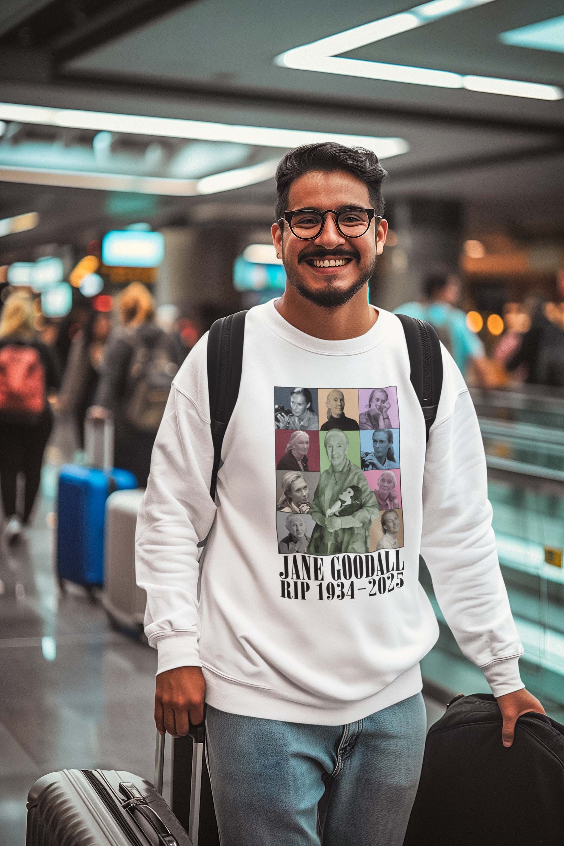 Honor the remarkable life of Jane Goodall, the pioneering primatologist and environmental conservationist, with this unique tribute t-shirt. Featuring a collage of iconic images of Jane Goodall across different phases of her life, this tee beautifully captures her warmth, dedication, and timeless influence on wildlife preservation.