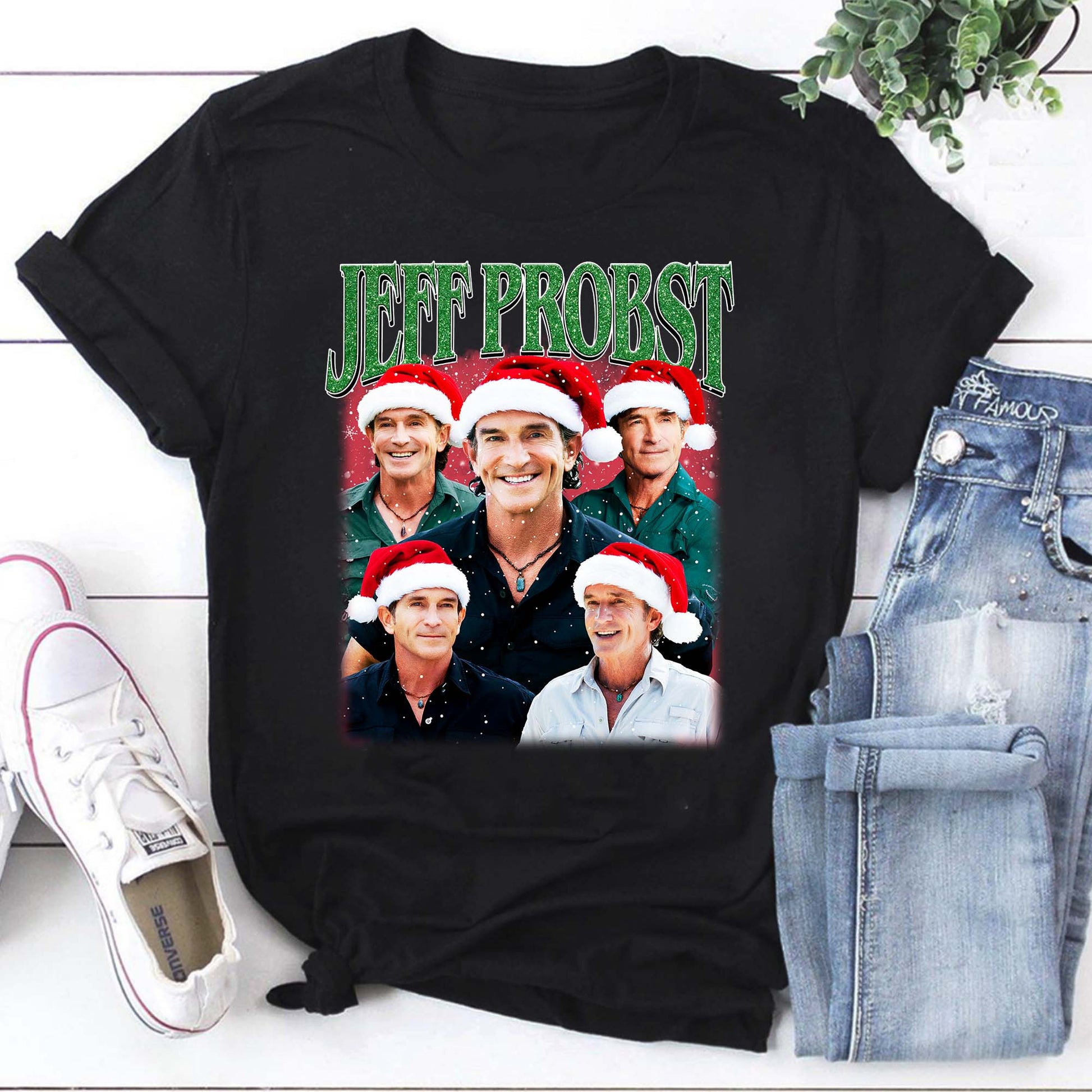 - Colorful, high-quality print with multiple images of Jeff Probst in Christmas hats