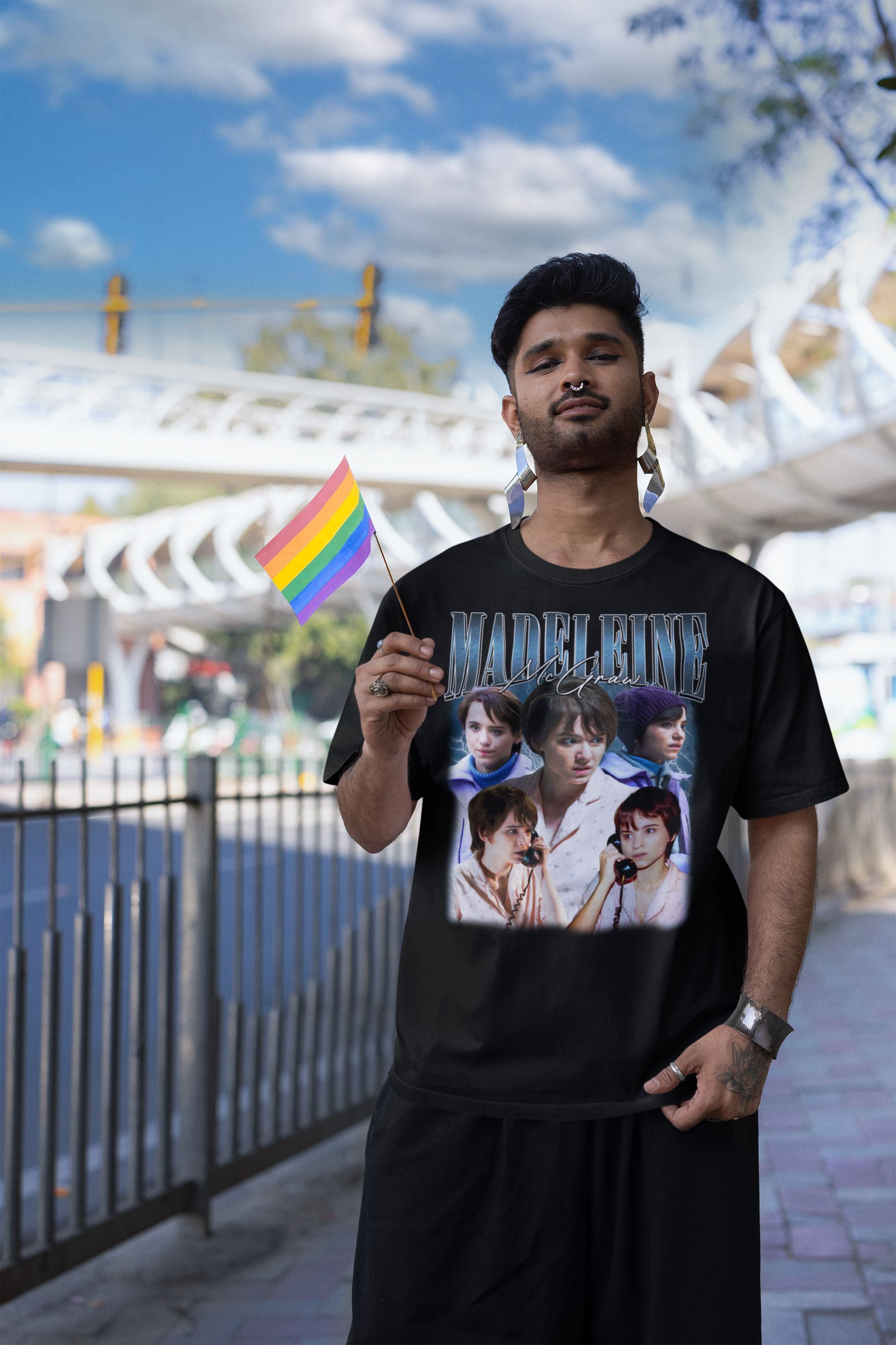 This striking black tee features a vintage-inspired collage of actress Madeleine McGraw, showcasing her memorable looks and intense expressions from acclaimed horror films. Perfect for fans who admire her captivating performances and want to wear their fandom boldly.