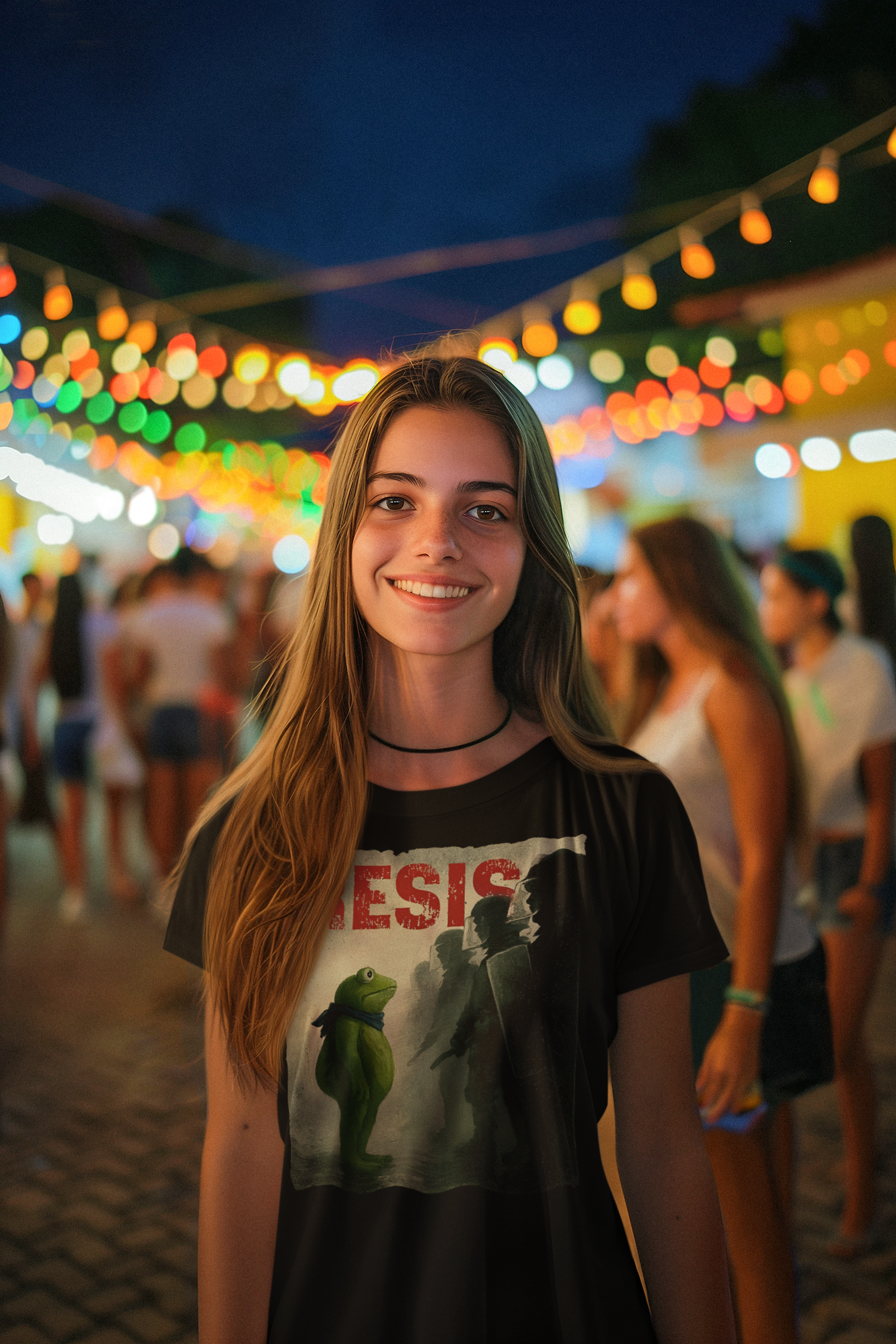 This bold, thought-provoking t-shirt features a unique illustration of Kermit the Frog facing off against riot police, under the powerful red text 'RESIST.' Perfect for fans of political satire and pop culture, this tee sparks conversation and expresses your stance on resistance and bravery.