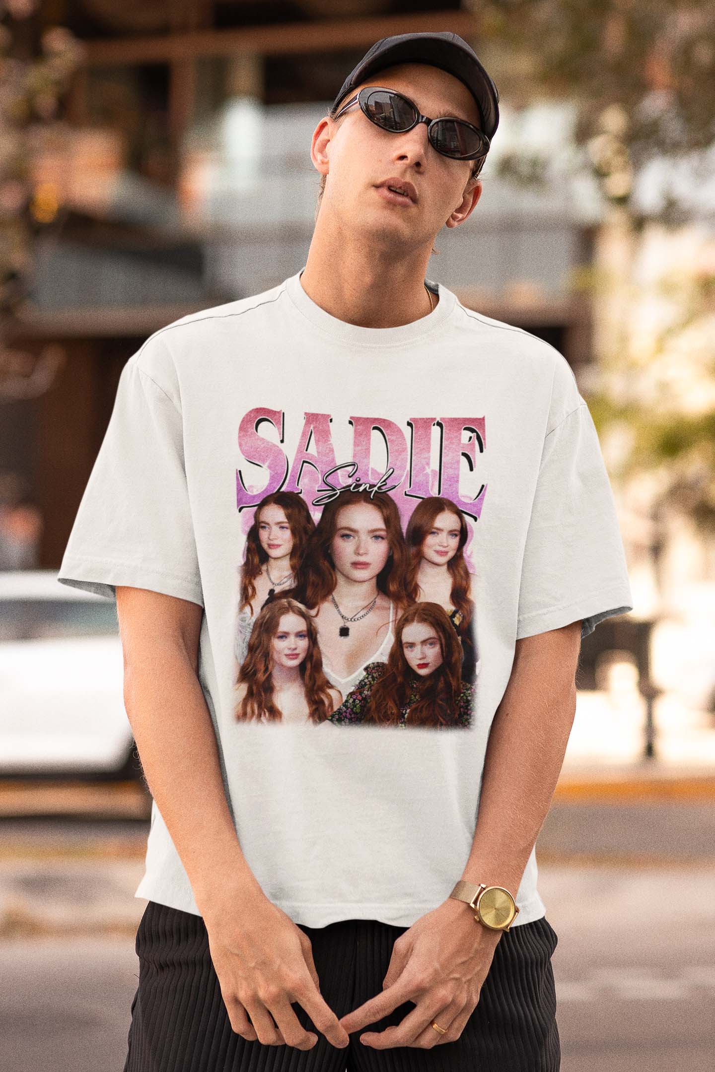 This Sadie Sink vintage-inspired graphic tee features a collage of stunning portraits of the talented actress Sadie Sink, set against a purple gradient background with bold lettering. Designed for fans who want to showcase their admiration, this t-shirt is both stylish and comfortable.