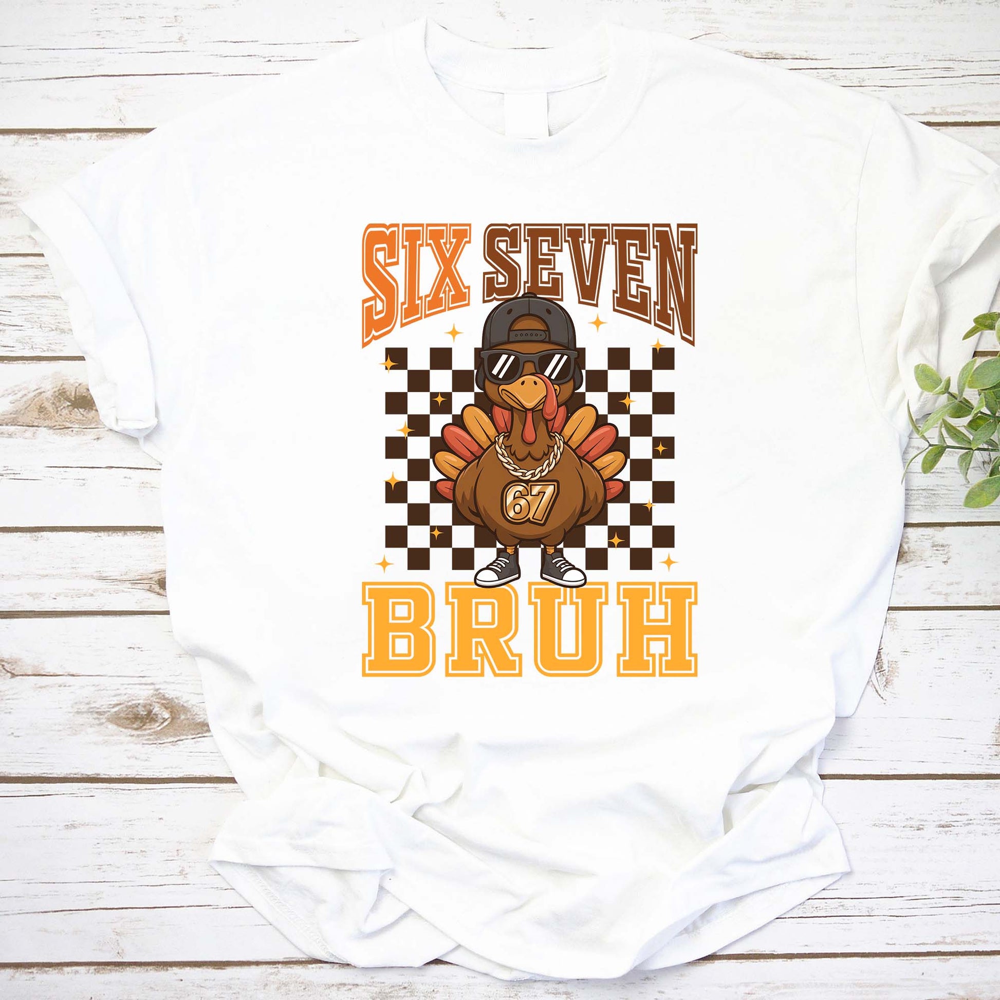 Get cozy and laugh out loud with this playful Six Seven Bruh hoodie, featuring a cool, hip turkey sporting sunglasses, a backward cap, and sneakers against a vintage checkered background. The bold orange and brown lettering adds a retro vibe perfect for casual wear or festive fun.