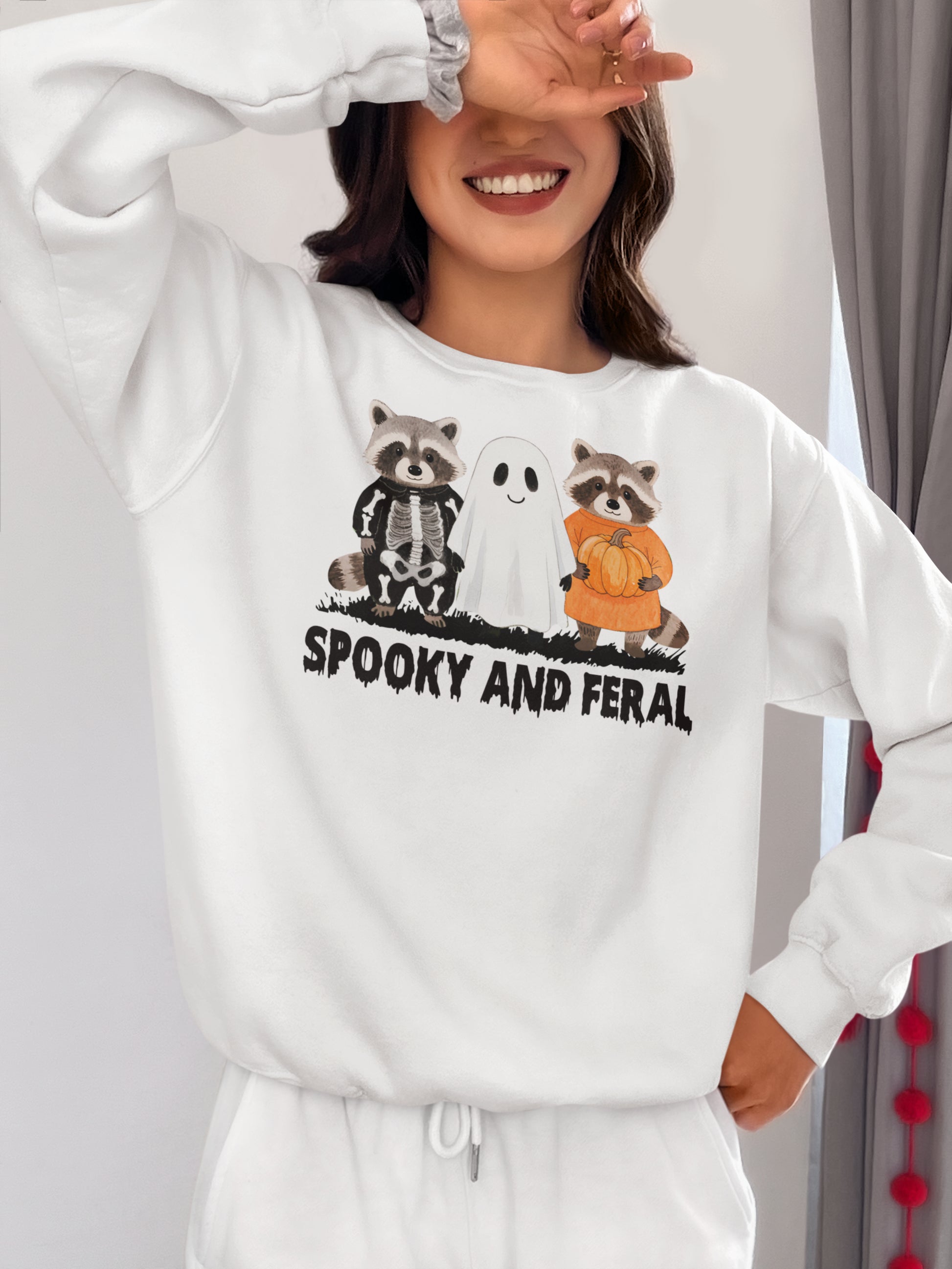 Spooky and Feral Halloween Hoodie with Cute Raccoon and Ghost Design