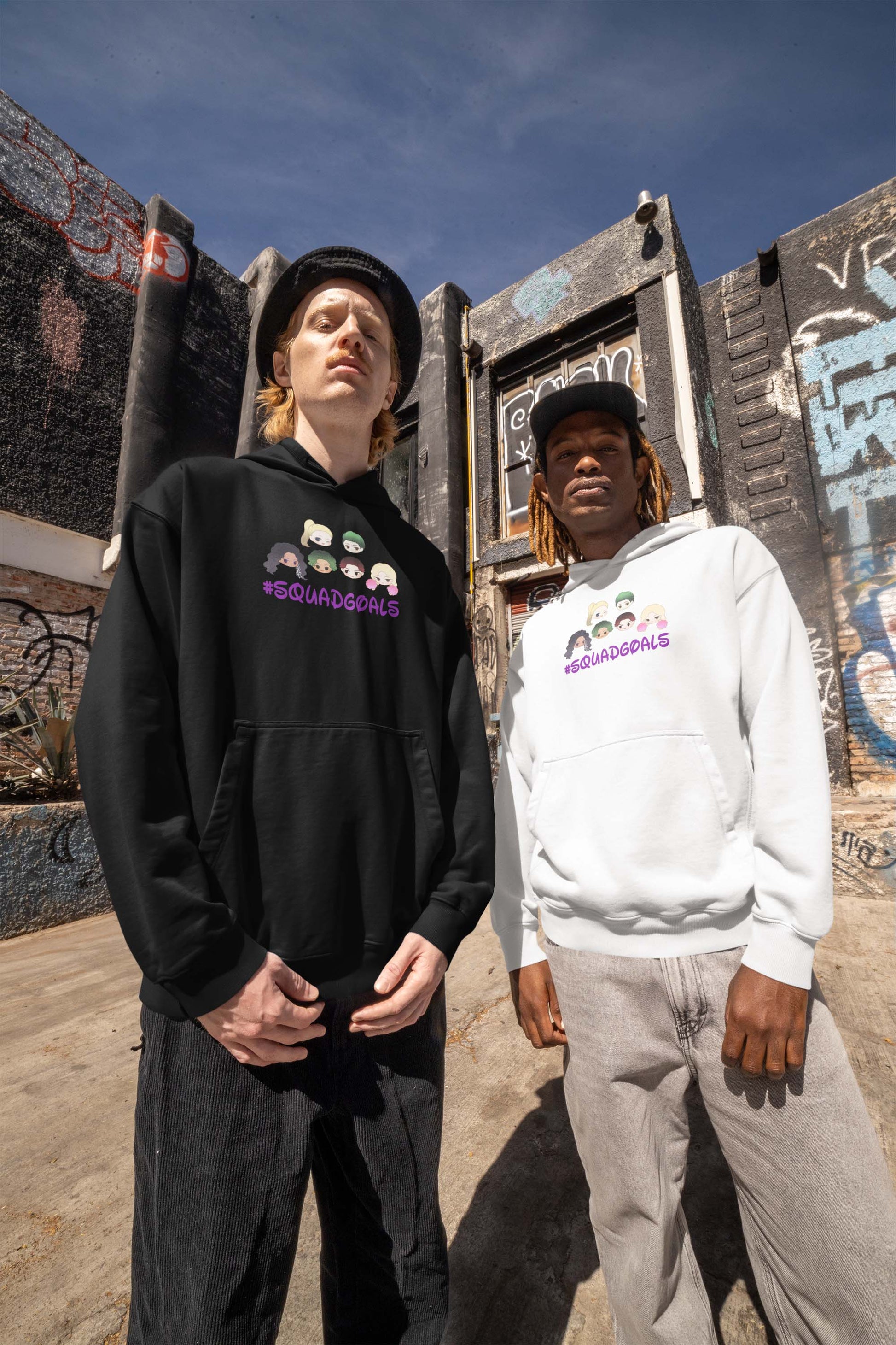 - Eye-catching #SquadGoals text with playful purple font