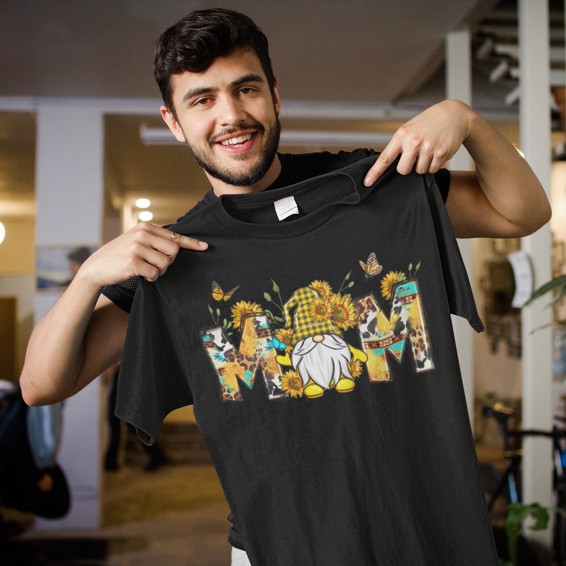 This cozy black sweatshirt features a whimsical 'MOM' design filled with sunflower accents, butterflies, and a cute gnome in a plaid hat. Perfect for showing love and appreciation with a fun, floral twist.