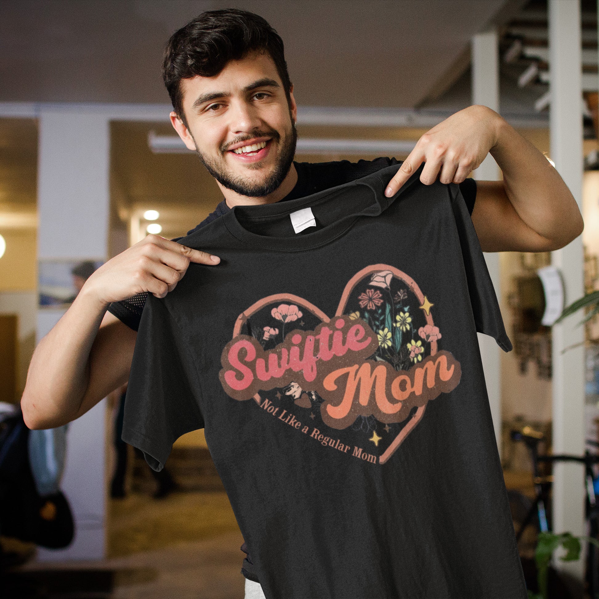 - Unique Design: A heart graphic filled with delicate flowers and the phrase "Swiftie Mom - Not Like a Regular Mom" in charming lettering.