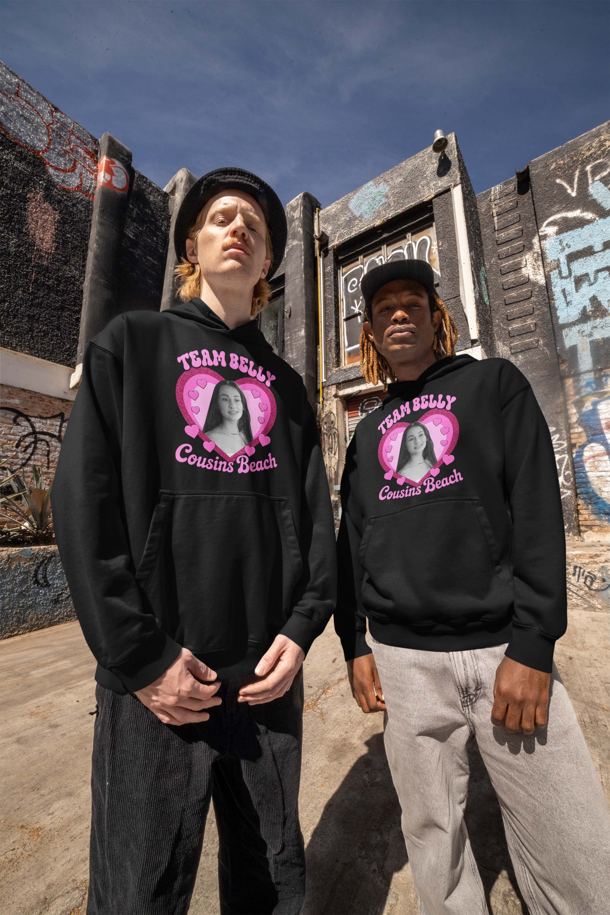 - Bold Text: Features the phrases "TEAM BELLY" and "Cousins Beach" in fun, pink retro fonts that pop against the black background.