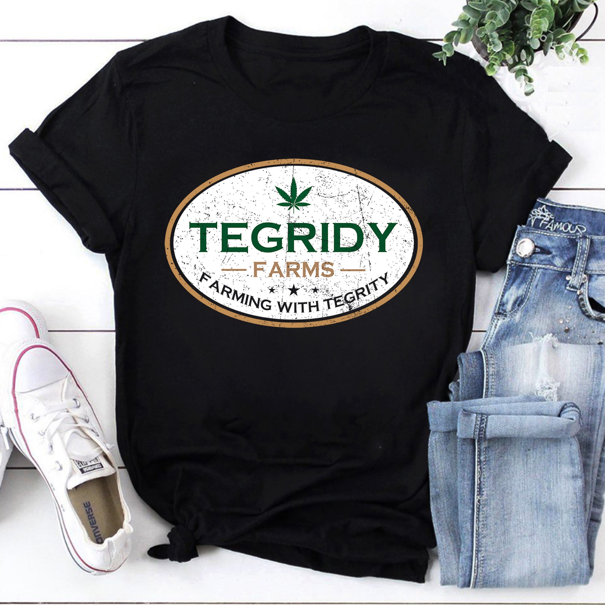 Celebrate the popular marijuana farming culture with this trendy Tegridy Farms T-shirt. Featuring a vintage-style distressed oval logo that reads 'Tegridy Farms - Farming with Tegridy' alongside a cannabis leaf icon, this shirt brings humor and style to your casual wear.