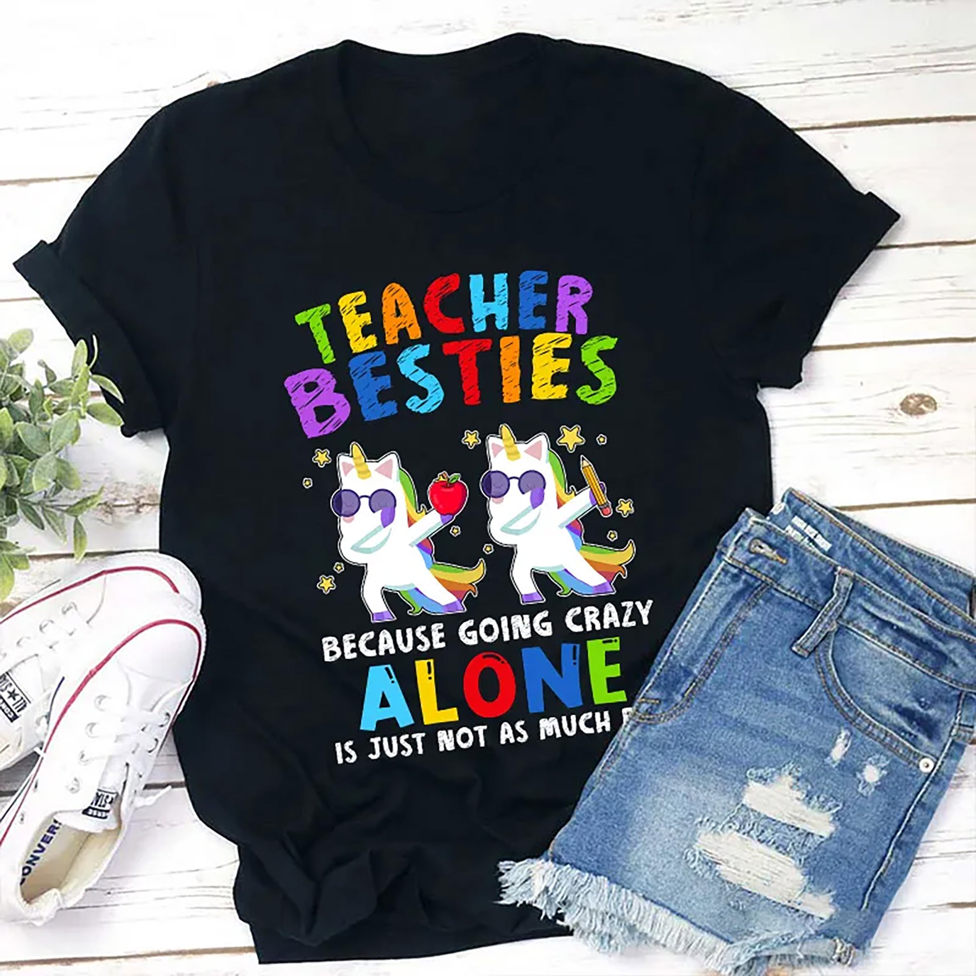 Teaching can be wild—but it’s a lot more fun when you’ve got your bestie by your side! This hilarious and heartwarming “Teacher Besties” t-shirt features two fabulous unicorns rocking shades, rainbows, and classroom essentials like an apple and pencil. With vibrant rainbow lettering and a bold message—“Because Going Crazy Alone Is Just Not As Much Fun”—this tee is made for the dynamic duo keeping it together (barely) all school year long.