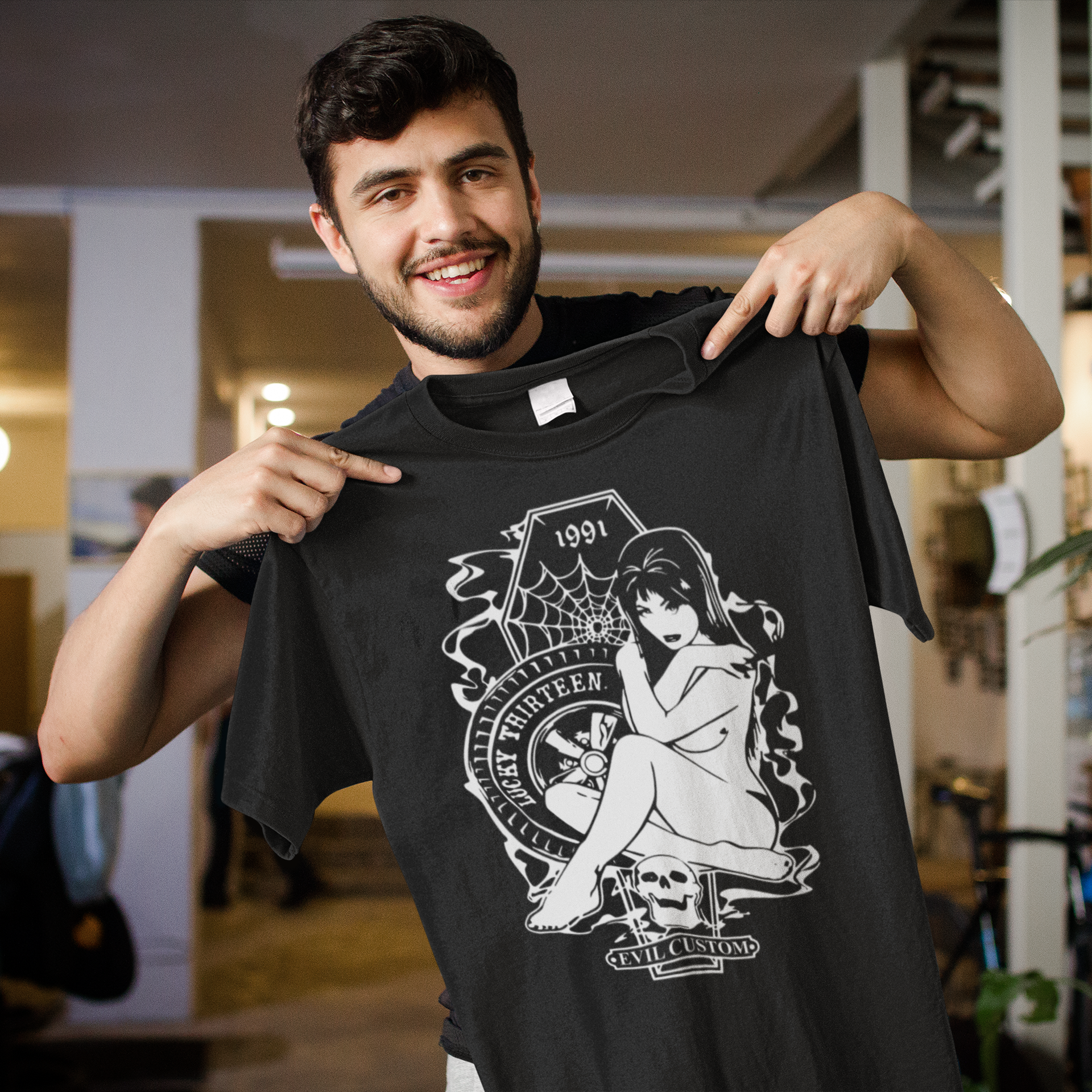 - Design: Retro pin-up girl art with cobweb, skull, and 'Lucky Thirteen' theme.