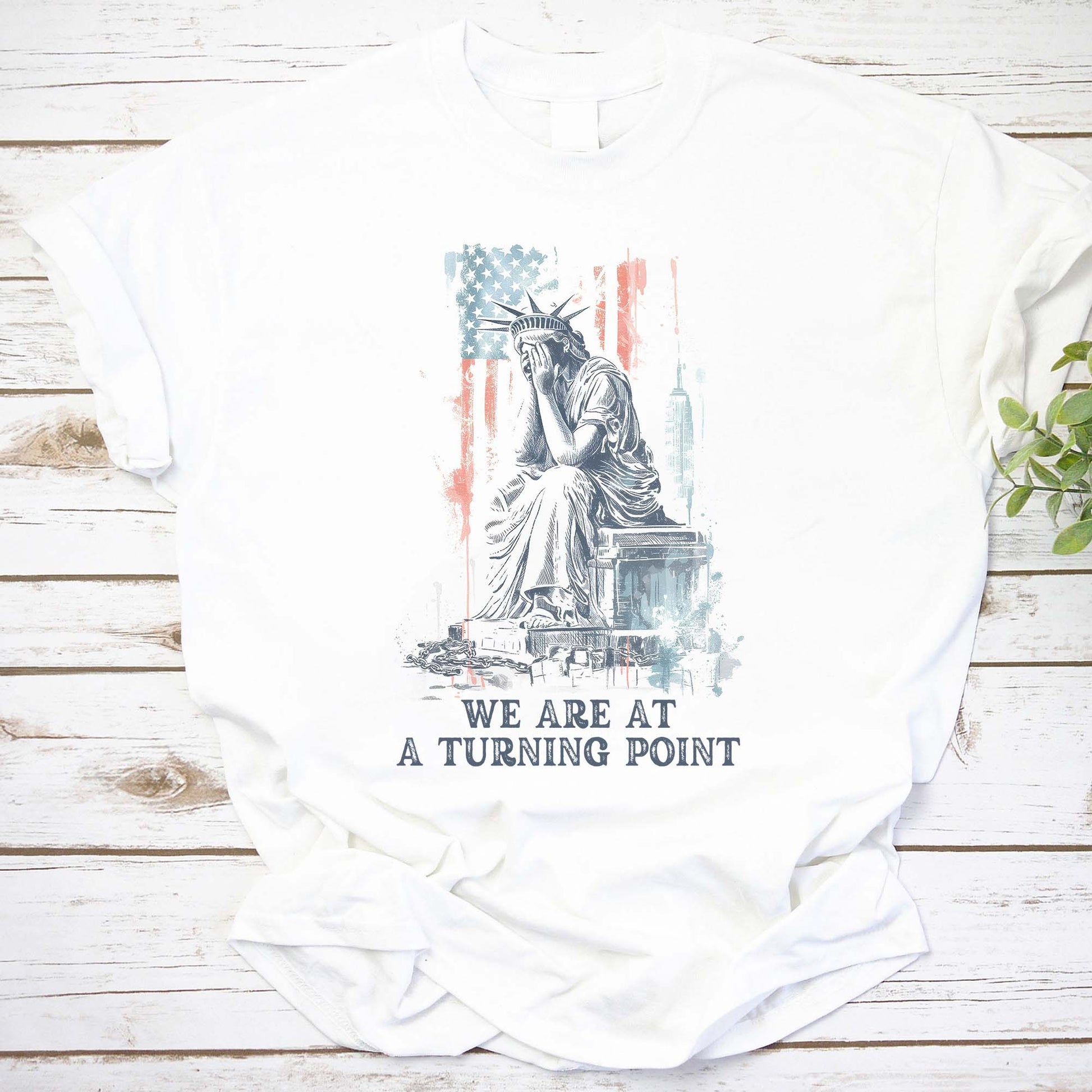 Express a strong message with this white t-shirt featuring a unique Statue of Liberty design. The statue is shown with its face in its hands against a faded American flag backdrop, paired with the bold text "We Are At A Turning Point". This tee captures a moment of reflection and change, perfect for meaningful conversations and awareness.
