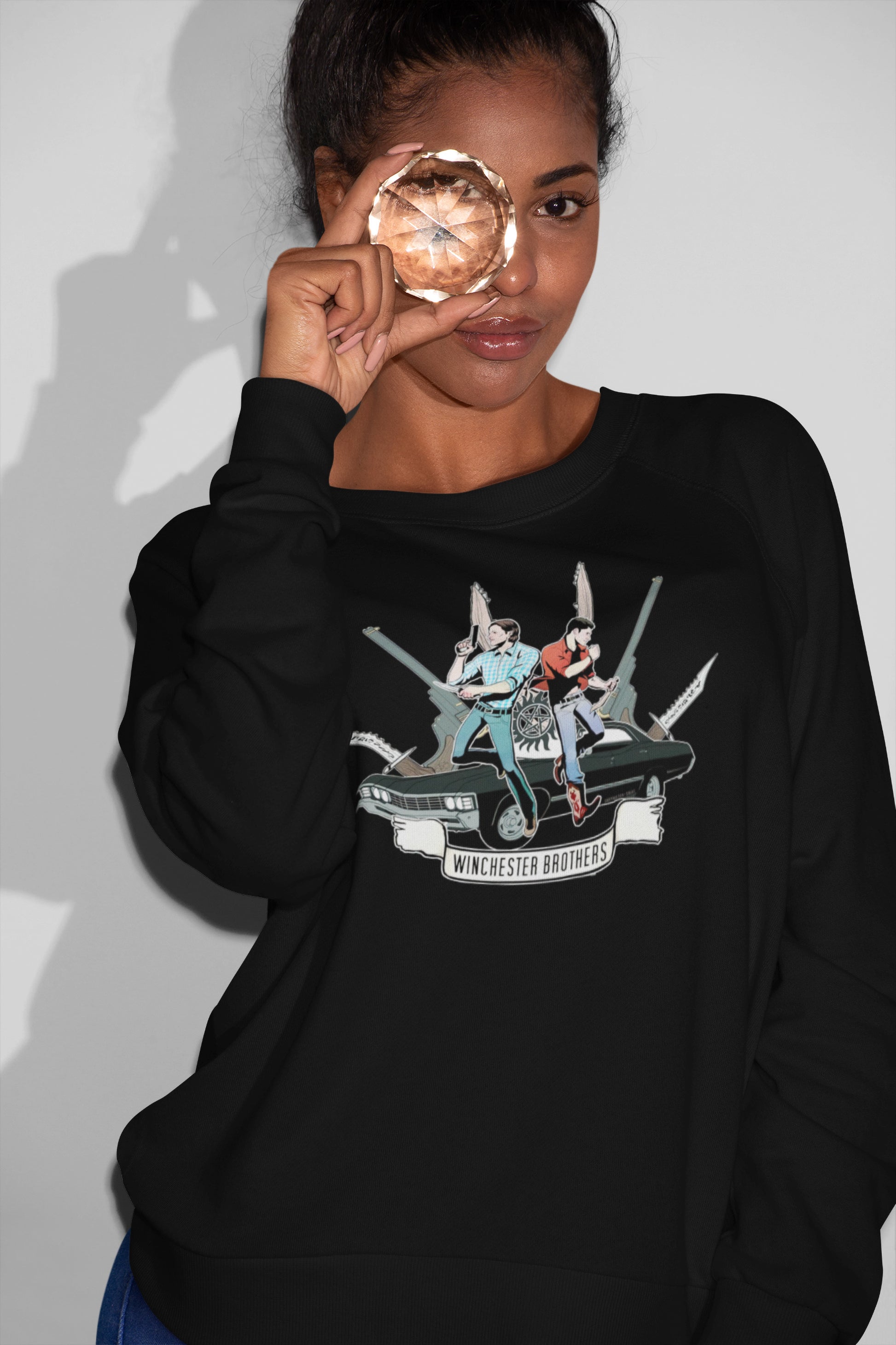 - Unique Design: Detailed illustration of the Winchester Brothers standing back-to-back on their signature Impala with iconic weapons.