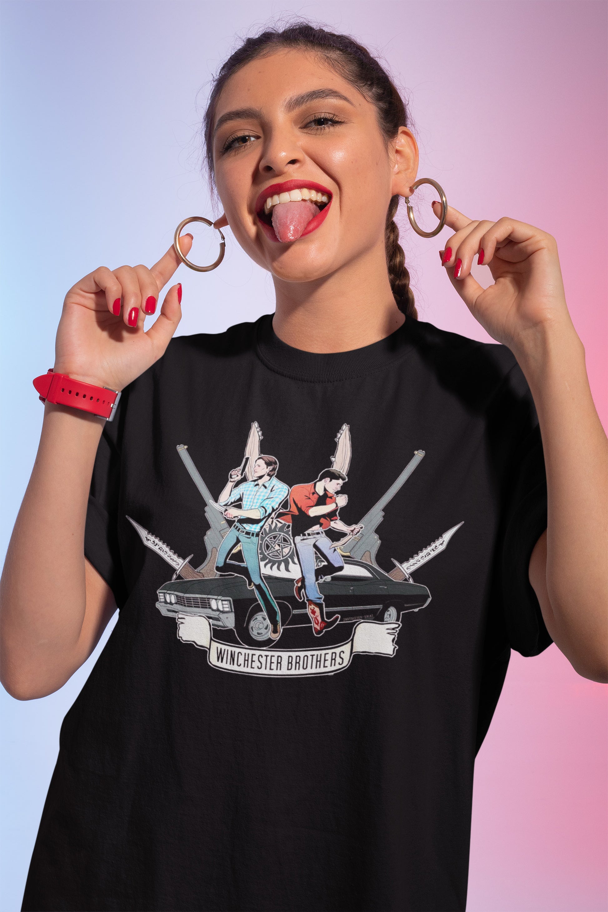 Show your fandom pride with this striking Winchester Brothers t-shirt, featuring bold artwork of the iconic brothers ready for action. Perfect for Supernatural enthusiasts and collectors, this tee captures the spirit of the legendary hunters.